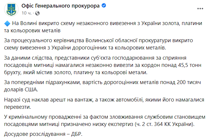 "При процессуальном руководстве Волынской областной прокуратуры разоблачена схема вывоза из Украины драгоценных и цветных металлов. По данным следствия, представители субъекта хозяйствования при содействии чиновников таможни пытались незаконно вывезти за границу более 45,5 тонн лома, содержавшего золото, платину и цветные металлы. По предварительным подсчетам, стоимость драгоценных металлов составила свыше 200 тысяч долларов США", - говорится в сообщении.