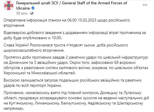 В среду, 15 февраля, Генштаб ВСУ обнародовал сводку о ситуации на фронте.