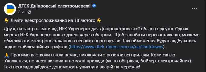 "Завтра лимиты от НЭК Укрэнерго для Днепропетровской области отсутствуют. Однако сети НЭК Укрэнерго повреждены из-за обстрелов. Чтобы предотвратить перегрузку, можем ограничивать электроснабжение в определенных энергоузлах. Такие ограничения будут происходить согласно стабилизационным графикам", - пишет ДТЭК.