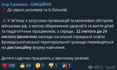 "В связи с угрозой провокаций и возможных обстрелов войсками России, с целью сохранения здоровья и жизни детей и педагогических работников, со среды, 22 февраля по 24 февраля (включительно) заведения общего среднего образования Броварской городской территориальной общины переводятся на дистанционную форму обучения. Детские садики работают в обычном режиме", - говорится в сообщении.