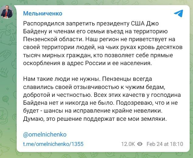 "Распорядился запретить президенту США Джо Байдену и членам его семьи въезд на территорию Пензенской области. Наш регион не приветствует на своей территории людей, на чьих руках кровь десятков тысяч мирных граждан, кто позволяет себе прямые оскорбления в адрес России и ее населения. Нам такие люди не нужны", - пишет Мельниченко у себя в телеграм-канале.