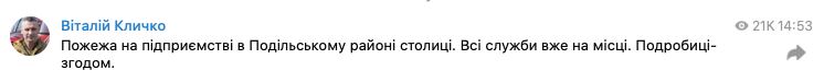 Кличко сообщает, что площадь пожара - около 2 тыс. кв.м. Возгорание произошло в металлическом складском помещении на территории одного из предприятий.