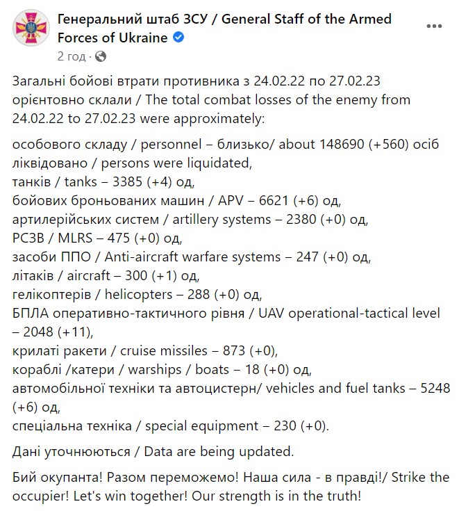 Общие боевые потери противника за период с 24 февраля 2022 года по 27 февраля 2023 года ориентировочно составили: