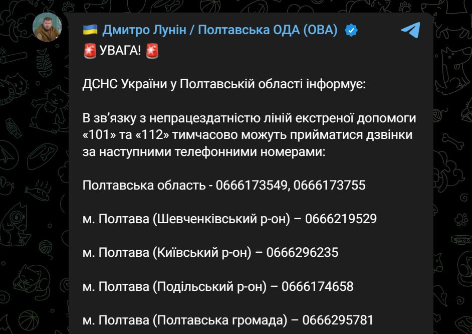 В Полтавской ОВА сообщили, что в регионе не работают линии экстренной помощи. Фото: Facebook