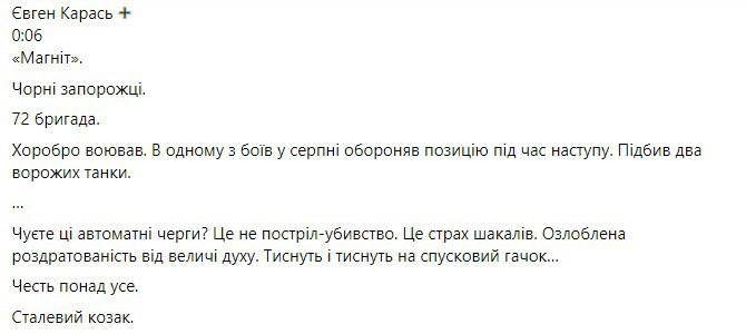В сети появилась информация, что расстрелянный военный в форме ВСУ на видео - это военнослужащий 72 бригады "Черных Запорожцев" с позывным Магнит.