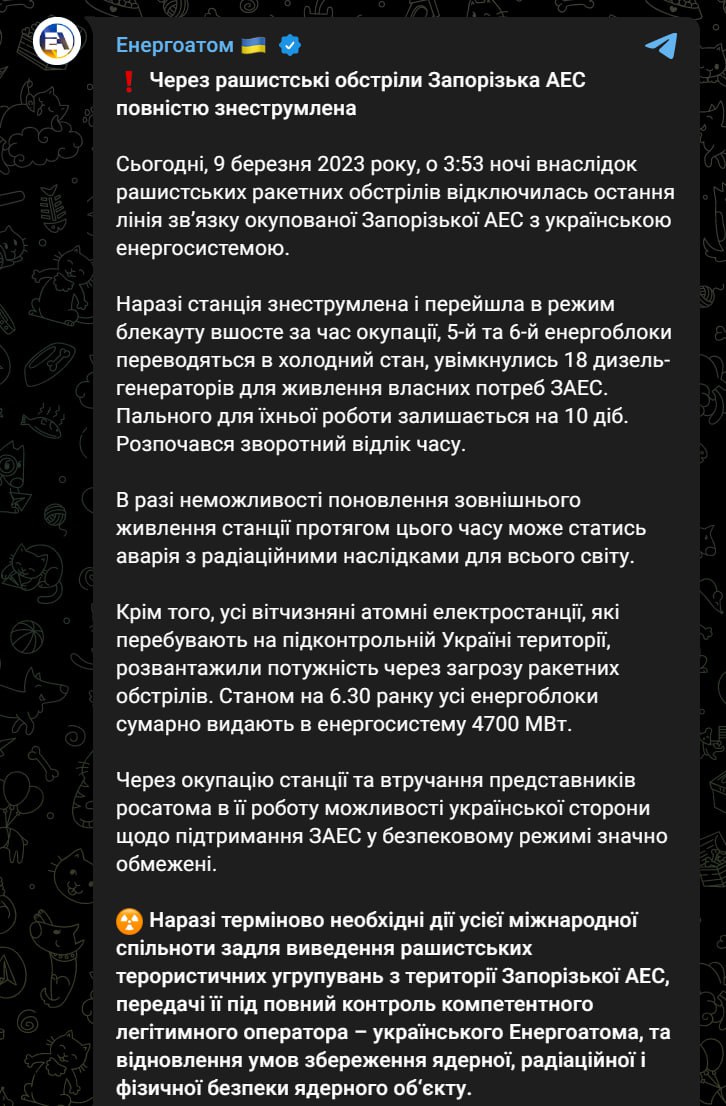 По данным компании, в 3:53 ночи в результате ракетных обстрелов отключилась последняя линия связи станции с украинской энергосистемой.