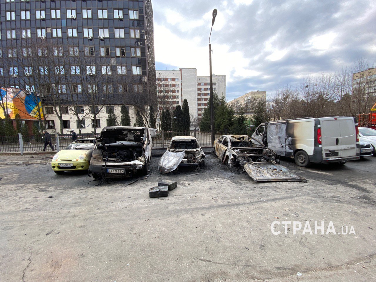 Также обломки сбитой ракеты упали в Святошинском районе. Пять автомобилей полностью уничтожены и еще 15 повреждены, сообщили в Нацполиции. Журналисты "Страны" насчитали на месте событий больше поврежденных машин.