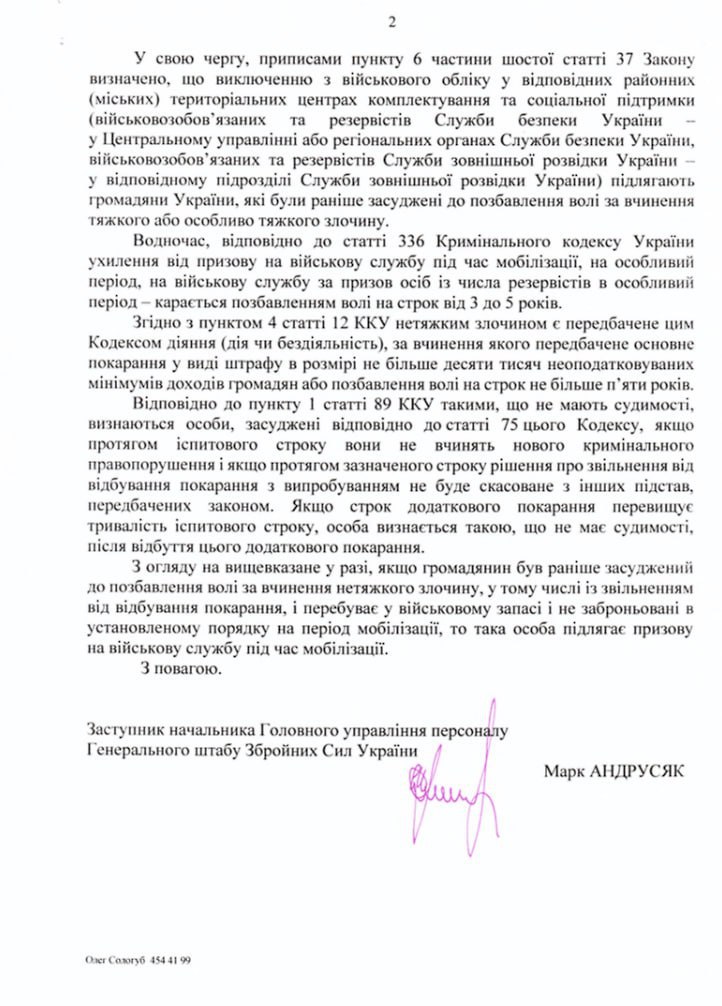 "Согласно пункту 10 статьи 14 Закона "О воинской обязанности и военной службе" по результатам медицинского осмотра гражданин Украины может быть взят на военный учет, несмотря на то, что он ранее был приговорен к лишению свободы, ограничению свободы, аресту или исправительным работам за совершение уголовного проступка, нетяжкого преступления, в том числе с освобождением от отбывания наказания", - говорится в ответе.
