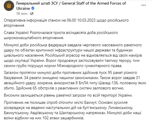 1. За прошедшие сутки РФ нанесла очередной массированный ракетный удар по объектам критической инфраструктуры и домам гражданского населения. Противник осуществил пуск 95 ракет. 34 ракеты были уничтожены. Также враг нанес 31 авиационный удар, в частности, использовал 8 БпЛА типа Шахед-136, половина которых сбита. Совершил 65 обстрелов из реактивных систем залпового огня.