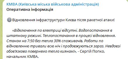 07.45 Примерно треть киевлян остаются без отопления после вчерашней ракетной таки РФ.