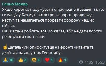 Ранее Маляр заявила о новой информационной атаке РФ насчет Бахмута. Ее суть - в распространении фейков о якобы разных позициях президента, Залужного и Сырского по части решений в вопросе Бахмута.