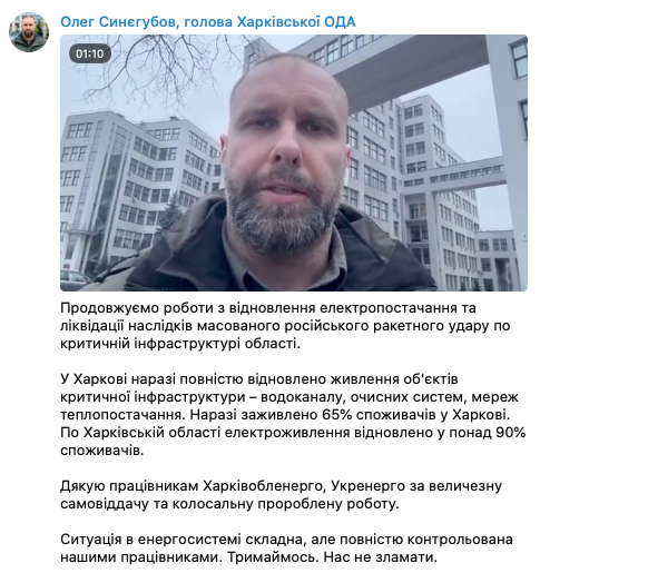 Электричество восстановили у 65% жителей Харькова и почти всей области - губернатор