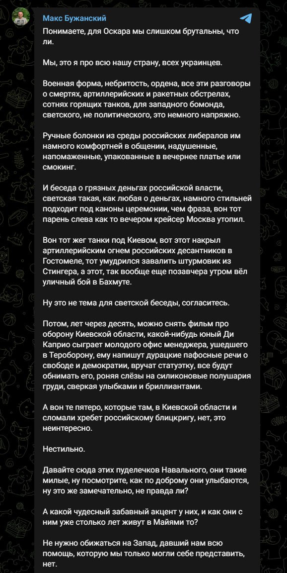 Нардеп Макс Бужанский предположил, что Украина для "Оскара" "слишком брутальна", а "ручные болонки из среды российских либералов им намного комфортней в общении".
