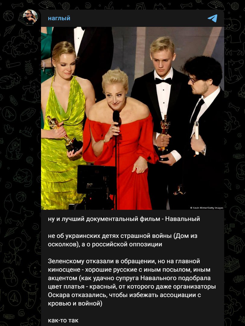 "Зеленскому отказали в обращении, но на главной киносцене - хорошие русские с иным посылом, иным акцентом (как удачно супруга Навального подобрала цвет платья - красный, от которого даже организаторы Оскара отказались, чтобы избежать ассоциации с кровью и войной). Как-то так", - пишет журналист Макс Назаров.