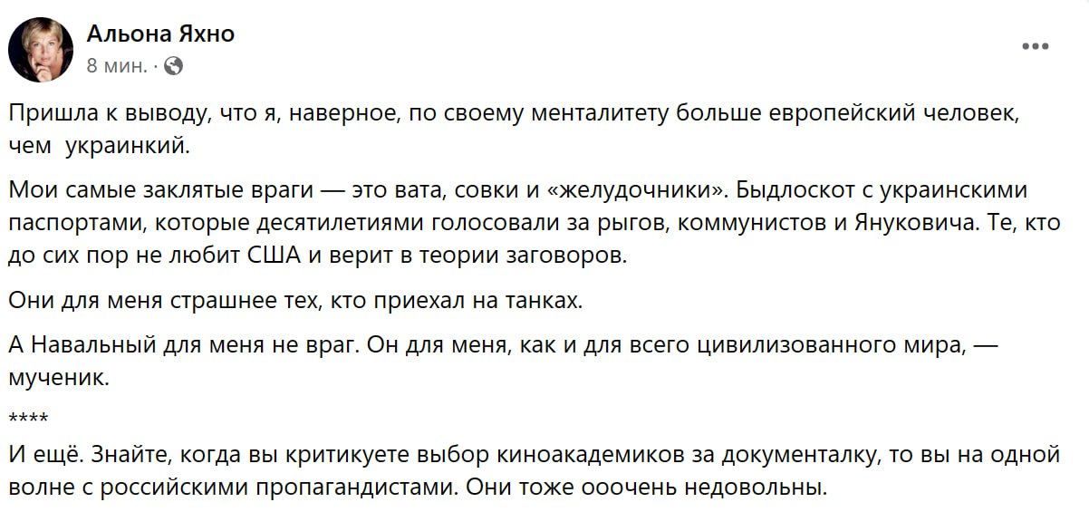 Но есть и другие точки зрения. Блогер Алена Яхно заявила, что Навальный для нее "не враг. Он для меня, как и для всего цивилизованного мира, - мученик".