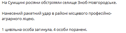 В понедельник, 13 марта, россияне обстреляли поселок Знобь-Новгородское в Сумской области. Ракетный удар нанесен в районе местного профессионально-аграрного лицея.
