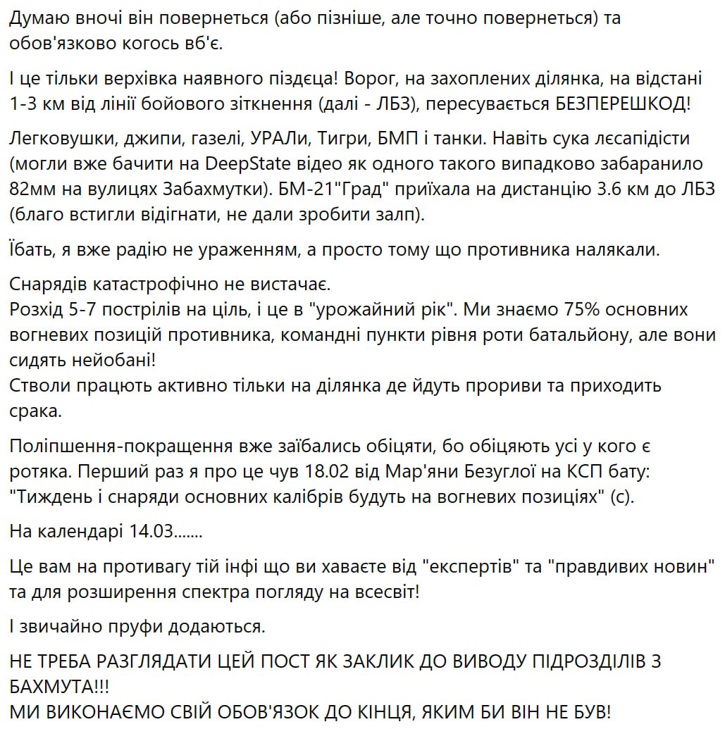 "Снарядов катастрофически не хватает. Расход 5-7 выстрелов на цель, и это в урожайный год. Мы знаем 75% основных огневых позиций противника, командные пункты уровня роты и батальона", но их не обстреливают.
