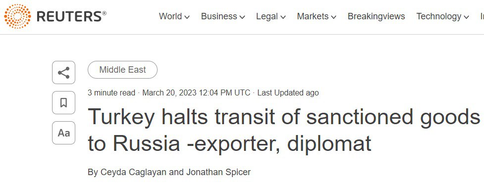 Запрет начал действовать 1 марта, уточнил Текделиоглу. То, что Анкара запретила транзит подсанкционных товаров в Россию, подтвердили агентству еще два неназванных источника.