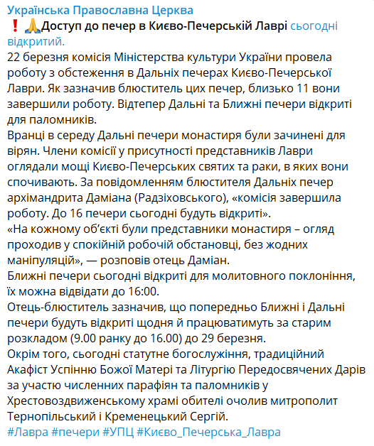 В УПЦ сообщают, что комиссия завершила работу около 11:00. И сейчас Дальние и Ближние пещеры снова доступны для паломников.