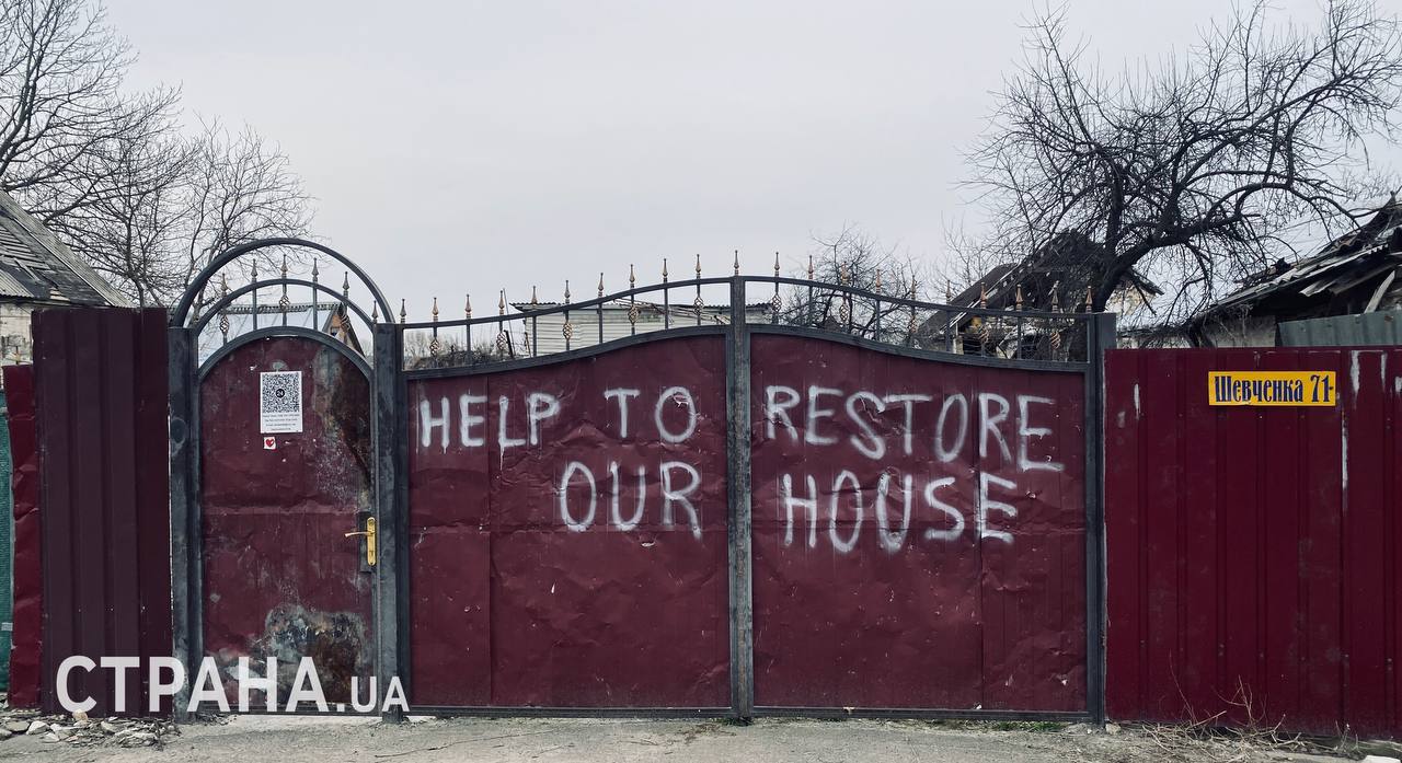 "Помогите восстановить наш дом", - написано на английском на воротах дома