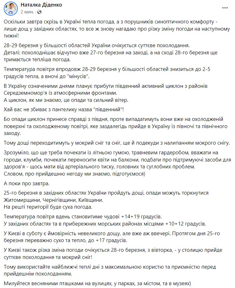 По данным Диденко, ощутимо похолодает уже 27 марта, в частности, в западных областях, в восточных регионах 28 марта еще удержится более теплая погода.