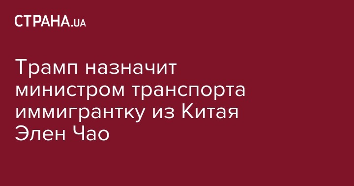 В администрации Дональда Трампа заявили о планах назначить на пост министра транспорта Элен Чао. Об этом сообщает "112 Украина".