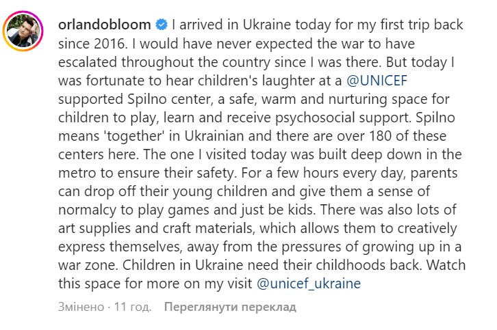 Голливудский актер Орландо Блум приехал в Украину впервые с 2016 года. Артист является послом доброй воли детского фонда ЮНИСЕФ. Он посетил один из центров фонда в Украине.