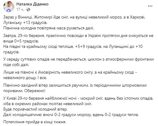Синоптик Наталья Диденко пишет, что 29 марта практически повсюду в Украине в течение дня ожидается не выше 0...+5. На юге и на крайнем востоке +5...+9, в Луганской области до +10.