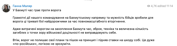 Она написала, что "в Бахмуте время играет против врага", который "пошел на принцип в ущерб себе".