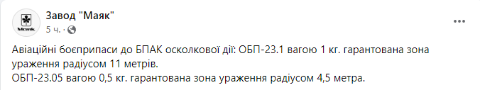 Украинский оборонный завод "Маяк" начал производить новые авиационные боеприпасы осколочного действия для подразделений ВСУ. Эти боеприпасы осколочного действия можно применять из беспилотных авиационных комплексов.