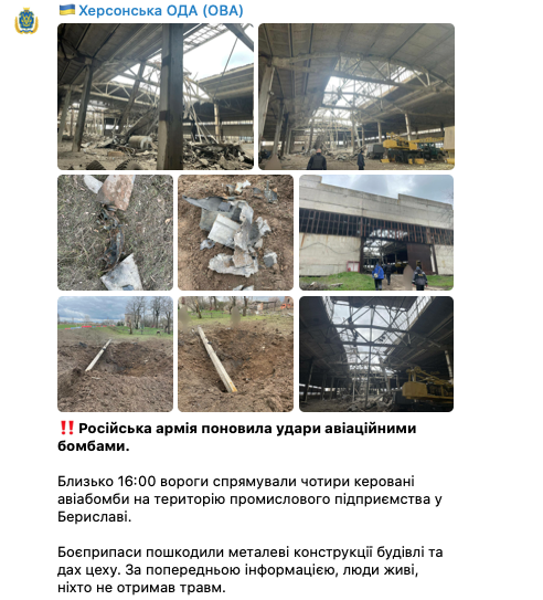 По территории промышленного предприятия в Бериславе на правом берегу Херсонской области были нанесены четыре удара управляемыми авиабомбами.