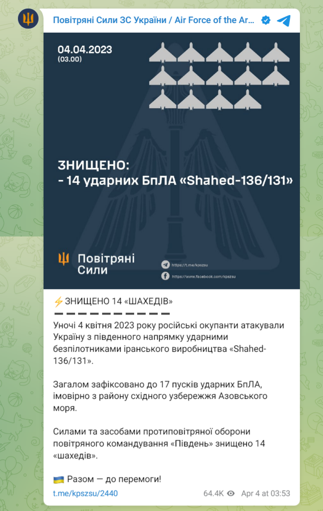 В ночь с 3 на 4 апреля россияне атаковали Украину "Шахедами". Всего было запущено до 17 дронов-камикадзе, силы ПВО сбили 14 из них.