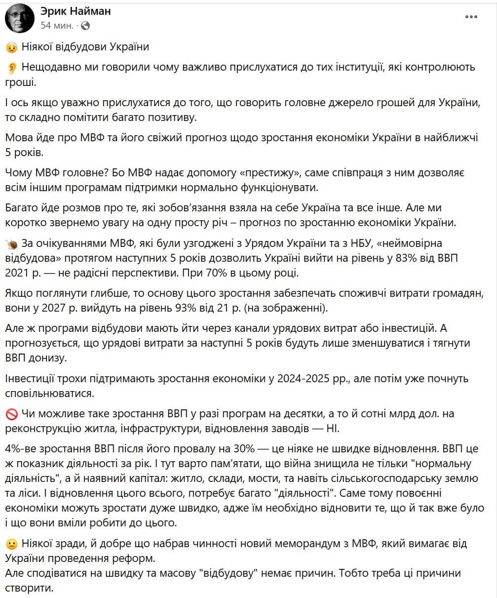Надеяться на быстрое и масштабное восстановление Украины нет причин, считает украинский финансовый эксперт Эрик Найман. Свое мнение он основывает на опубликованном недавно прогнозе Международного валютного фонда.