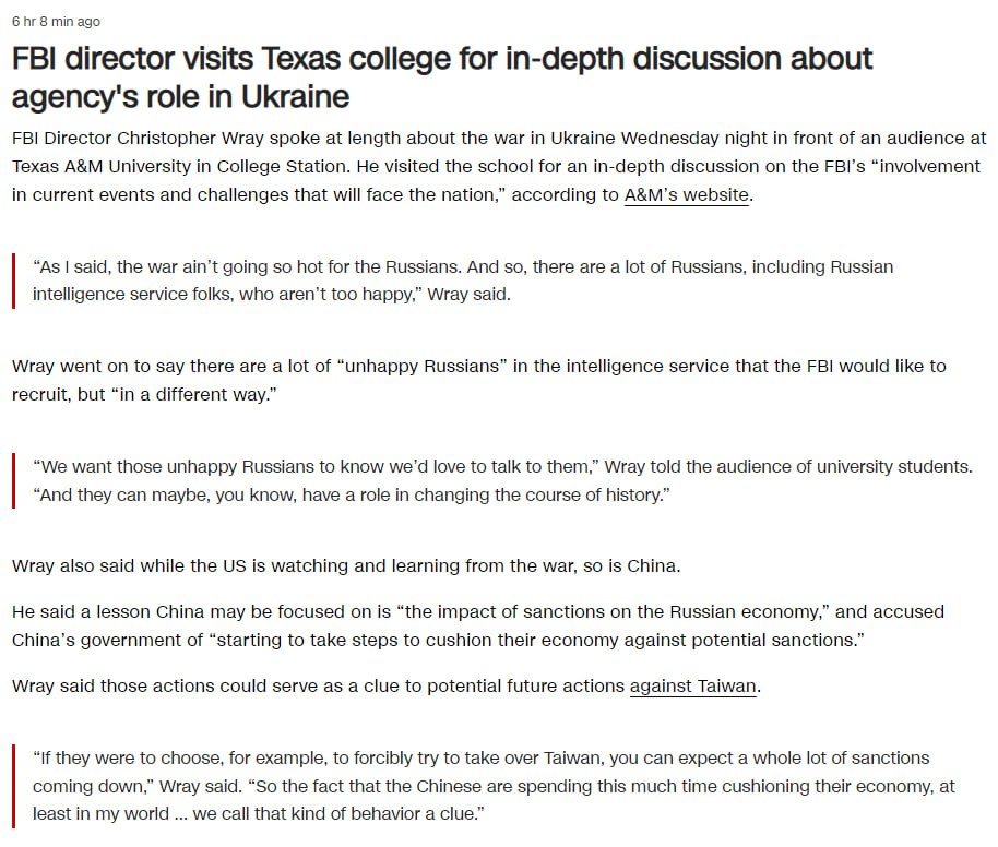 11:08 Директор ФБР заявил, что США наблюдают за войной в Украине и учатся на ней, и Китай тоже.