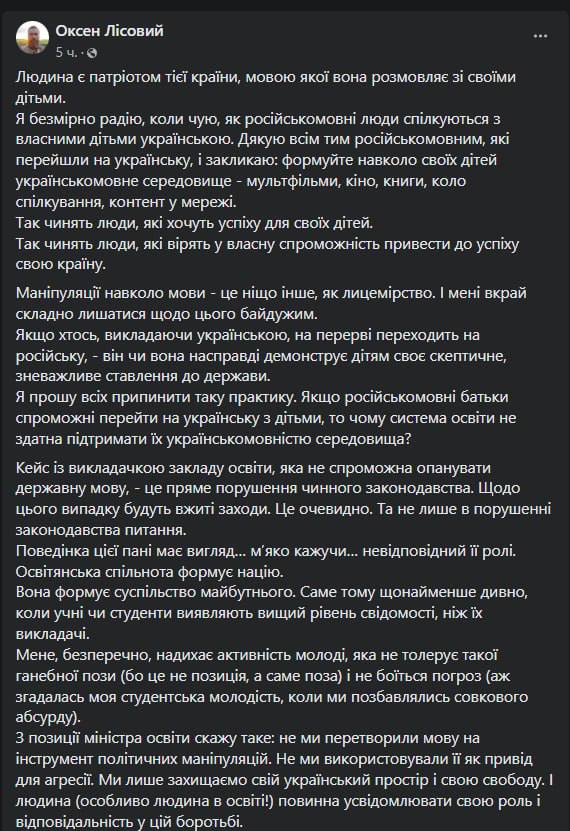 Комментируя ситуацию в Государственном налоговом университете в Ирпене, где преподавательница отказалась вести пары по философии на украинском, Лисовый заявил, что будут приняты меры.