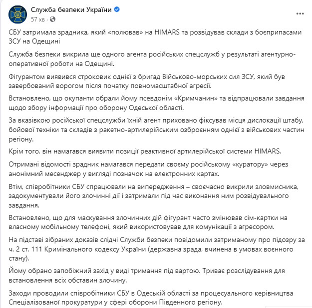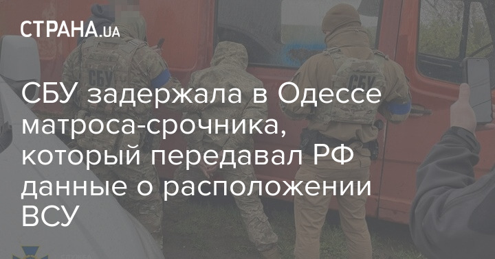 СБУ сообщает о задержании в Одессе срочника Военно-морских сил Украины, который, по версии следствия, передавал российским военным данные о дислокации штаба, боевой техники и складов боеприпасов, а также пытался зафиксировать расположение установок Himars.