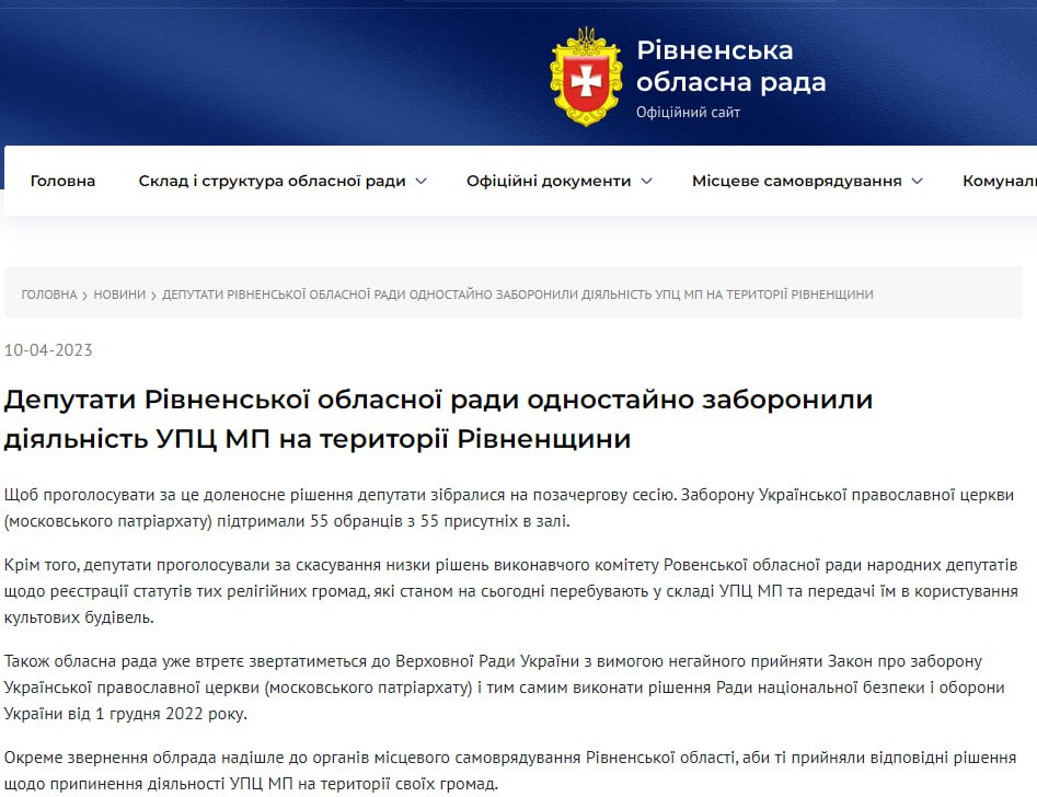Ровенский облсовет единогласно проголосовал за запрет деятельности УПЦ на территории области. Ранее сегодня горсовет Ровно проголосовал за лишение УПЦ права пользования земельными участками в городе.