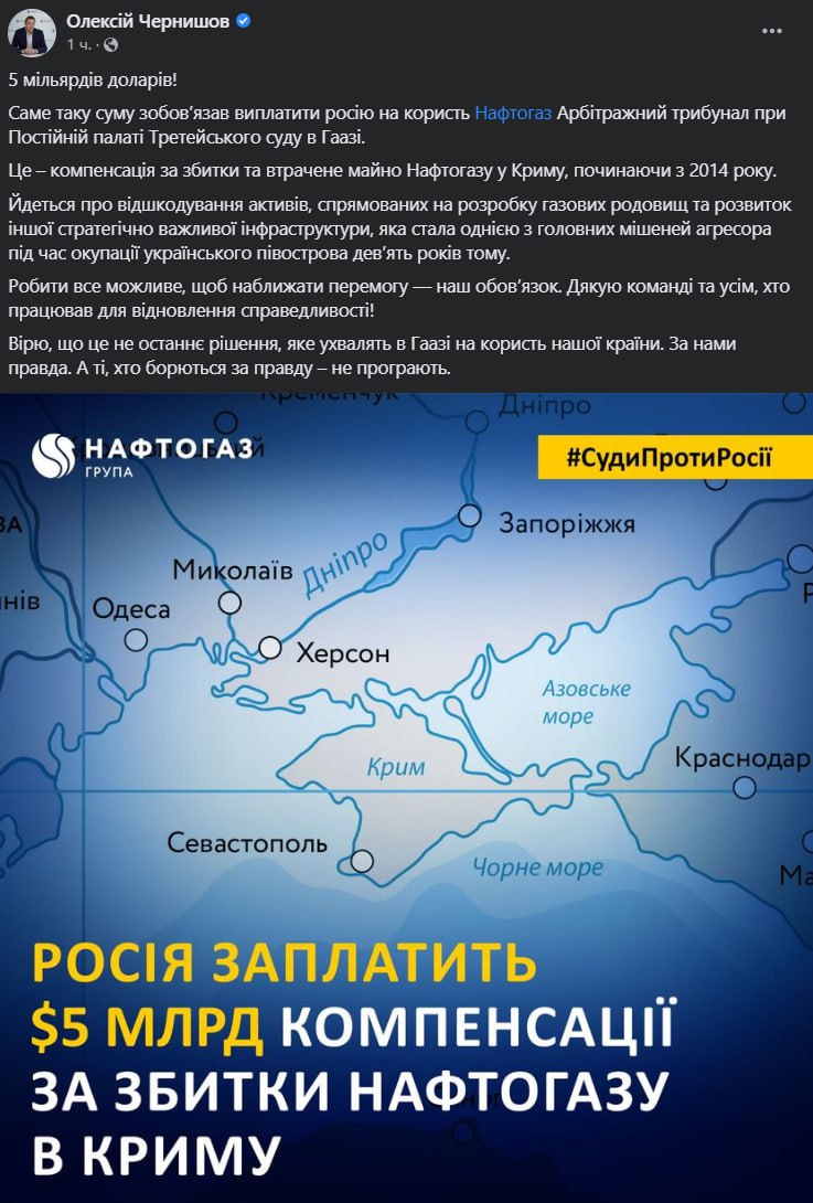 Арбитраж Третейского суда в Гааге обязал РФ выплатить пять миллиардов долларов за убытки и утраченное имущество "Нафтогаза" в Крыму, начиная с 2014 года.
