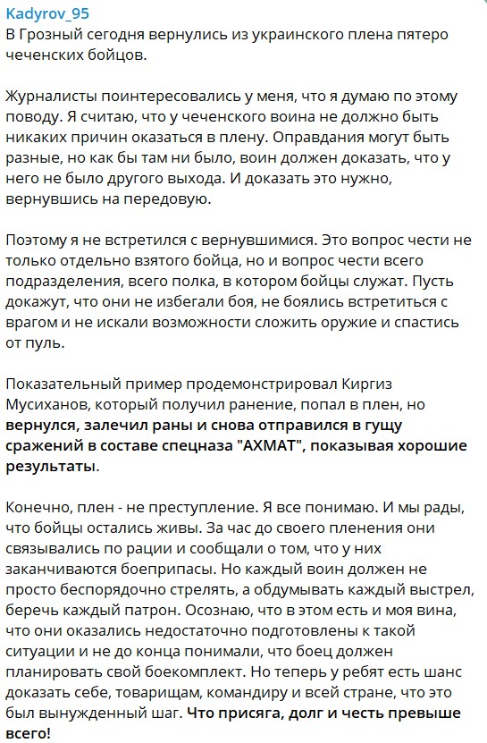 "Оправдания могут быть разные, но как бы там ни было, воин должен доказать, что у него не было другого выхода. И доказать это нужно, вернувшись на передовую. Поэтому я не встретился с вернувшимися", - написал Кадыров.