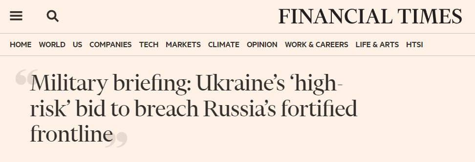 "Классический подход при наземном наступлении - прорваться в тыл противника, на одном или нескольких участках, и нанести сосредоточенный удар по центру тяжести противника. Успешные примеры без господства в воздухе редки", - говорит другой эксперт FT - Бен Барри, бывший командир британского батальона механизированной пехоты.