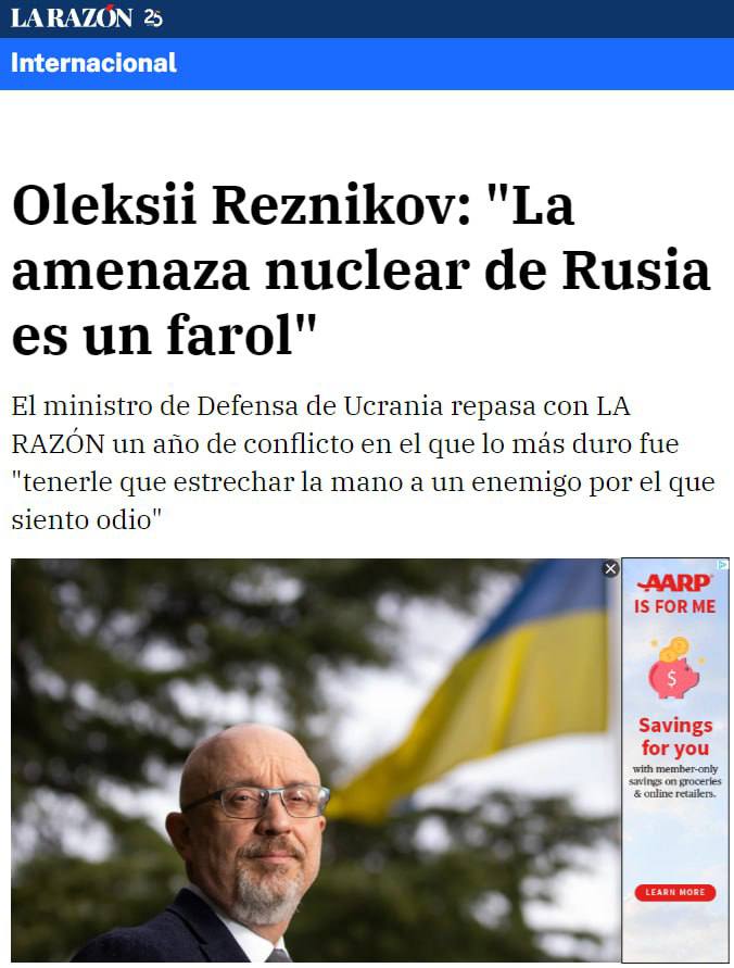 13:25 Министр обороны Украины Алексей Резников дал большое интервью испанскому изданию La Razon.