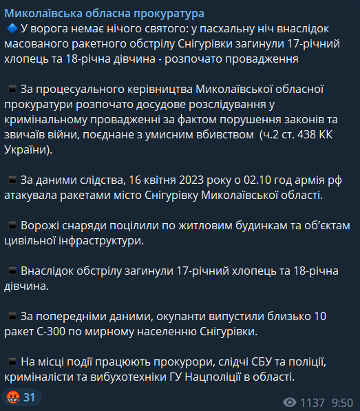 "Начато досудебное расследование по уголовному производству по факту нарушения законов и обычаев войны, соединенное с умышленным убийством (ч.2 ст. 438 УК Украины). По данным следствия, 16 апреля 2023 года в 02:10 часа армия РФ атаковала ракетами город Снигиревку Николаевской области. Вражеские снаряды попали в жилые дома и объекты гражданской инфраструктуры. В результате обстрела погибли 17-летний парень и 18-летняя девушка", - говорится в сообщении.