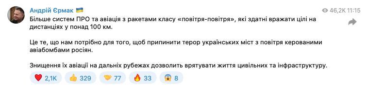 "Уничтожение их авиации на дальних рубежах позволит спасти жизнь гражданским и инфраструктуру", - написал Ермак.