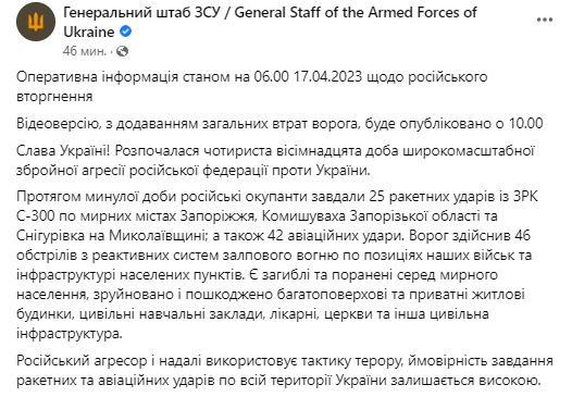 1. За минувшие сутки силы РФ нанесли 25 ракетных ударов по мирным городам Запорожье, Камышеваха и Снегиревка, а также 42 авиационных удара. Враг совершил 46 обстрелов из реактивных систем залпового огня по позициям ВСУ и инфраструктуре. Есть погибшие и раненые среди мирного населения, разрушены и повреждены жилые дома, учебные заведения, больницы, церкви.
