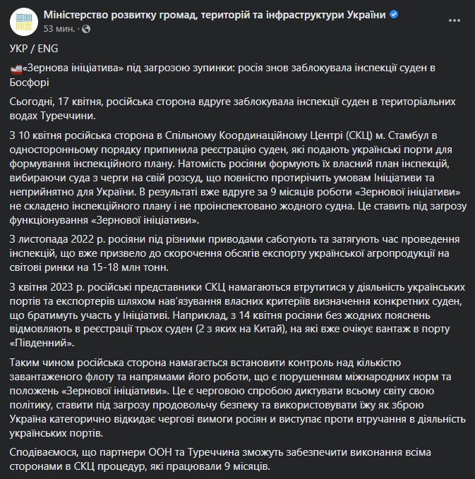 14.37 Зерновая сделка под угрозой, сообщает Министерство инфраструктуры.