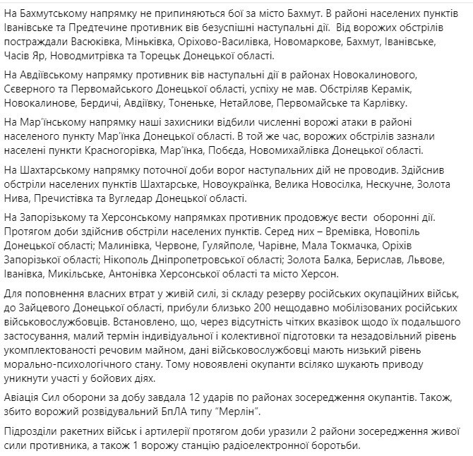 2. Противник сосредоточил основные усилия на ведении наступления на Лиманском, Бахмутском, Авдеевском и Марьинском направлениях.