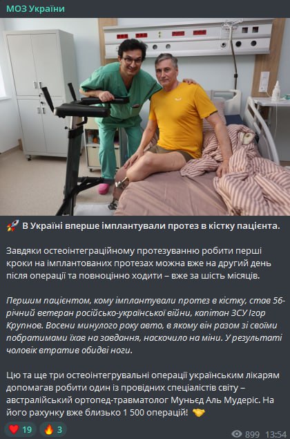 Первым пациентом, которому провели такую операцию стал 56-летний капитан ВСУ Игорь Крупнов. Осенью он потерял обе ноги, подорвавшись на мине когда ехал в авто с бойцами на задание.