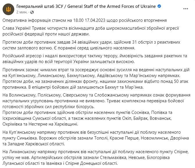 Тем временем война в Украине продолжается уже 418-й день. Мы следим за новостями 17 апреля в своем онлайне.