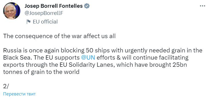 "Последствия войны затрагивают всех нас. Россия в очередной раз блокирует в Черном море 50 судов с остро необходимым зерном. ЕС поддерживает усилия ООН и будет продолжать содействовать экспорту через дороги солидарности ЕС, которые доставили в свет 25 миллиардов тонн зерна", - подчеркнул глава европейской дипломатии.