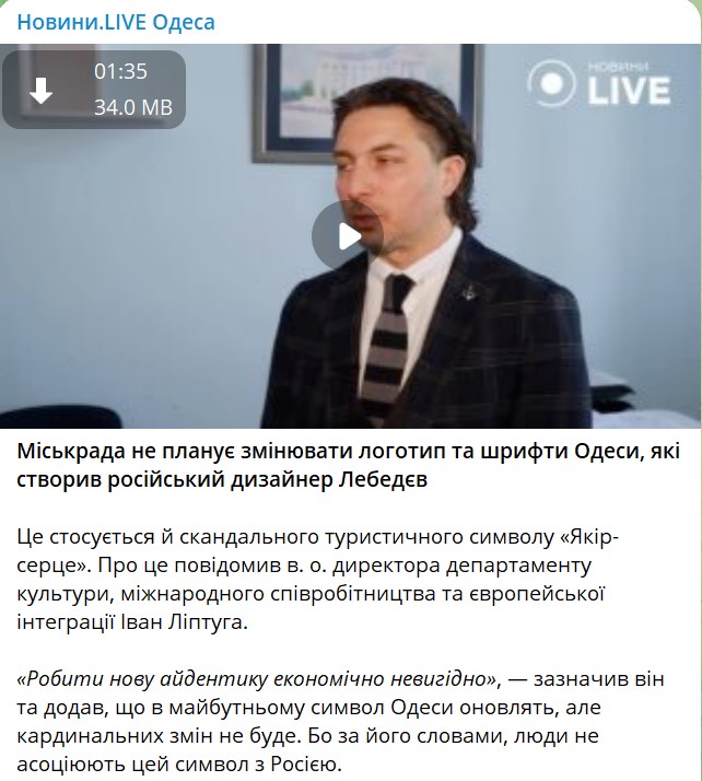 Так, и.о. директора Департамента культуры, международного сотрудничества и европейской интеграции Одессы Иван Липтуга заявил, что менять логотип города неуместно, т.к. люди не ассоциируют этот символ с Россией.